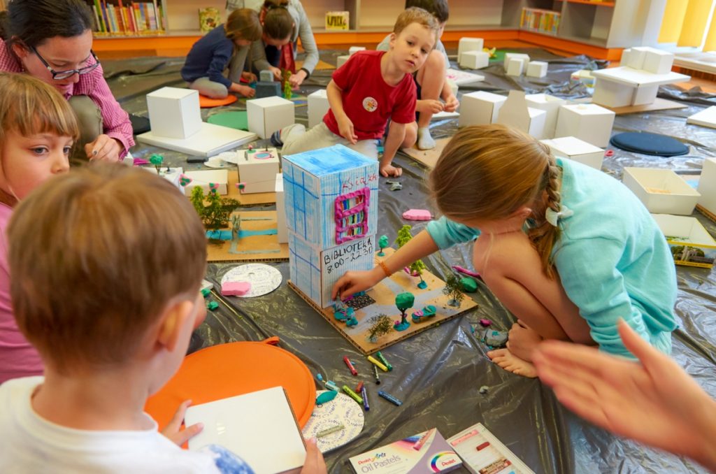 Działania: Z przygotowanych materiałów dzieci tworzą budynek i wnętrza ich biblioteki marzeń.