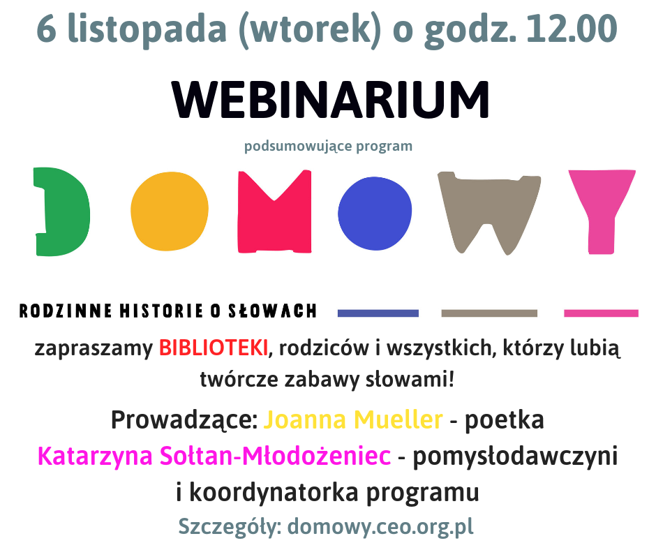 6 listopada (wtorek) o godz. 12.00 zapraszamy bibliotekarki i bibliotekarzy uczestniczących w programie oraz wszystkich zainteresowanych twórczym spojrzeniem na polszczyznę na webinarium podsumowujące program DoMowy. Rodzinne historie o słowach, realizowany w ramach programu „Ojczysty – dodaj do ulubionych”. Gościem specjalnym webinarium będzie poetka Joanna Mueller.